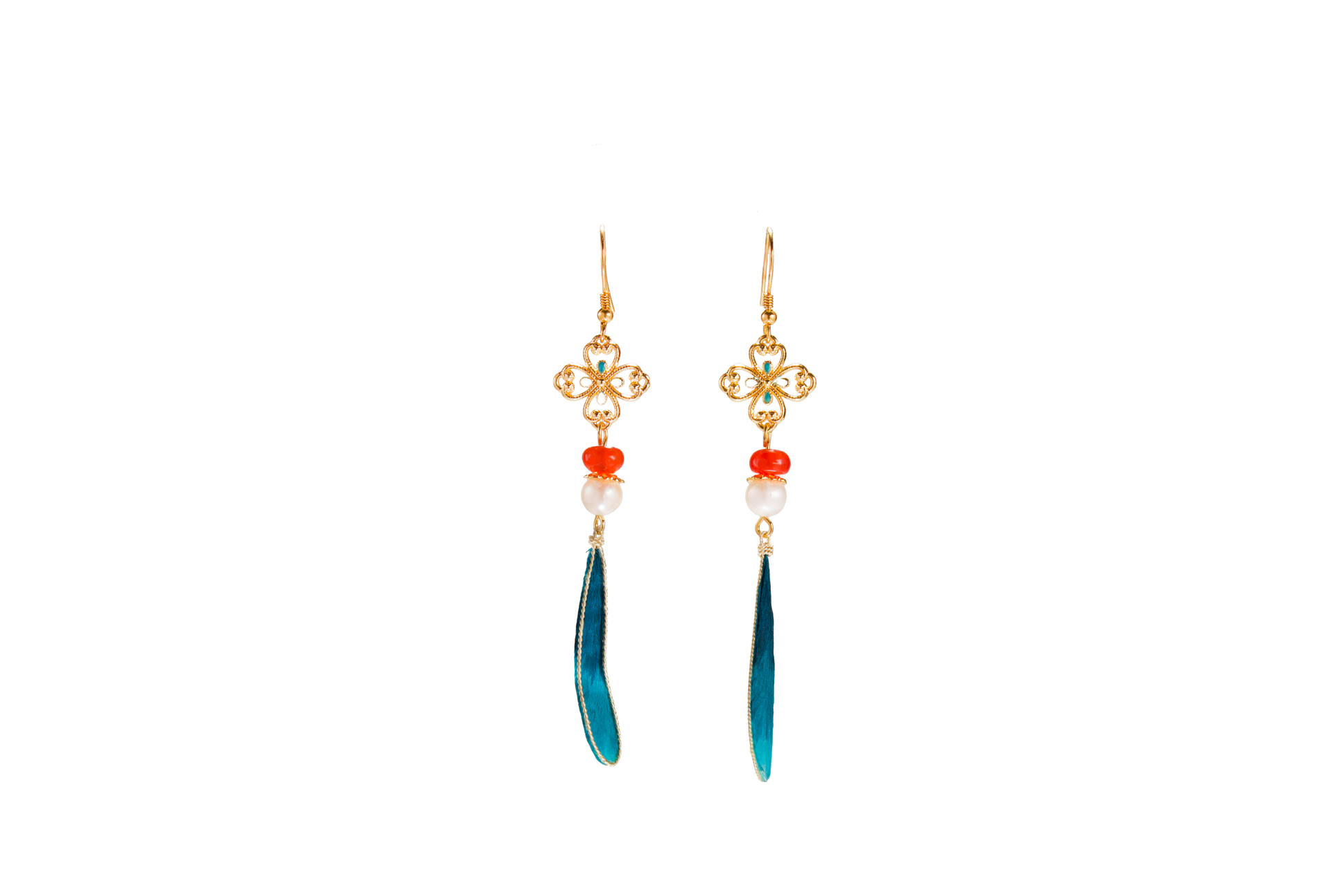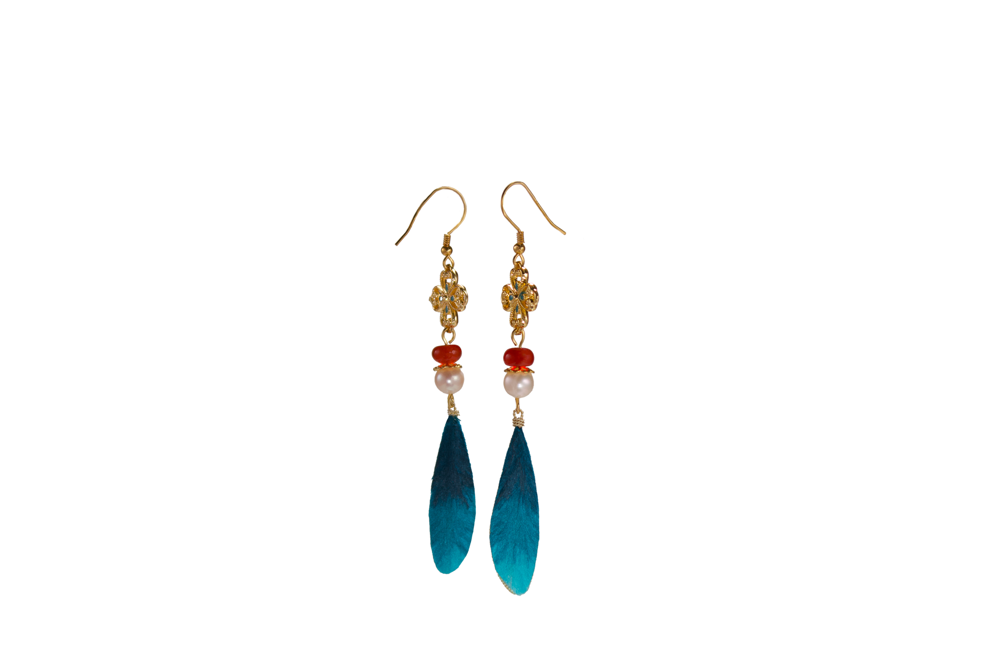 - Teardrop-shaped feather pendant in shimmering blue-green for graceful movement