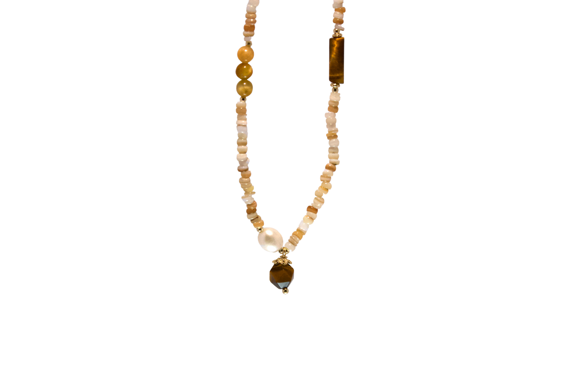 Rihuang – Tiger Eye, Pearl & Carved Shell Necklace