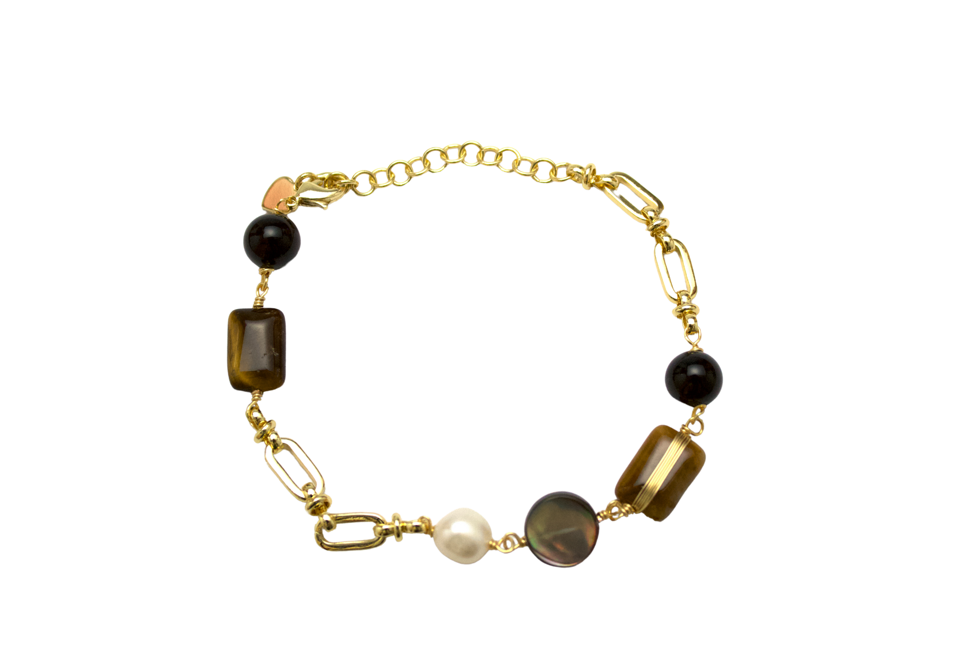 "TingXue" - Tiger’s Eye, Obsidian, Abalone Shell & Pearl Chain-Link Bracelet